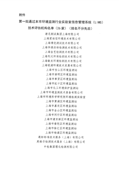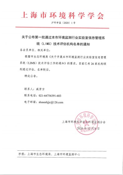 近日,上海市环境科学学会环境监测分会发布了沪环学监〔2020〕1号文《关于公布第一批通过本市环境监测行业实验室信息管理系统(LIMS)技术评估机构名单的通知》,中检集团理化检测有限公司成为上海市第一批通过LIMS技术评估的第三方检测单位。