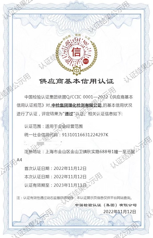 2022年11月12日,中检集团理化检测有限公司(以下简称中检理化)顺利取得了中国检验认证集团的“供应商基本信用认证”证书。这标志着中检理化在规范运营、诚信经营上得到了集团的认可。多年来,中检理化旨在推进企业守法诚信经营,积极促进公司信用体系建设,在新时代树立企业家诚信形象和企业家精神。这份殊荣是集团对中检理化公司信誉度的认可,更为新、老客户在深度合作上提供了一份保障。