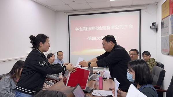 2024年4月19日下午,中检集团理化检测有限公司工会召开第四次代表大会,进行换届选举。红双喜集团群团工作办公室主任王凌、办公室副主任、集团工会副主席华珏尔、中检集团理化检测有限公司总经理张晓楠、总经理助理李志参加会议。